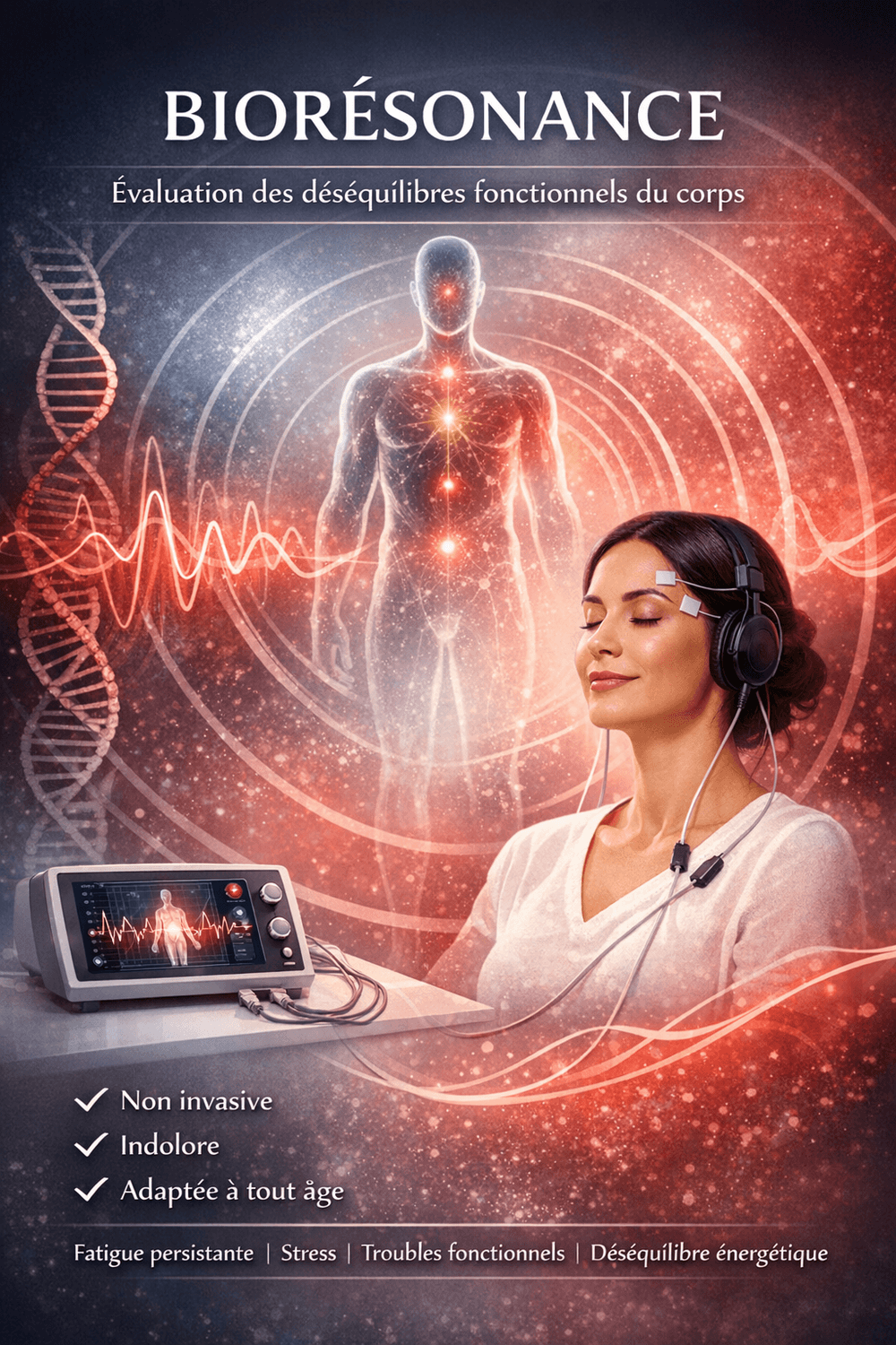 La biorésonance est une méthode non invasive qui analyse les fréquences émises par le corps afin d’identifier des déséquilibres fonctionnels. Elle permet de mieux comprendre ce que votre corps exprime et d’agir en douceur pour favoriser son rééquilibrage naturel.