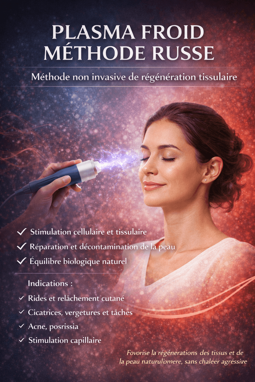 Le Plasma Froid (méthode russe) est une technologie médicale avancée et non invasive qui utilise un « quatrième état de la matière » – le plasma – à basse température. Il s'agit d'un flux d'énergie composé d'ions, d'électrons et de particules neutres, appliqué localement pour régénérer les tissus, stimuler la production de collagène et éliminer les imperfections cutanées sans endommager la peau saine.